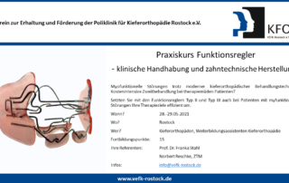 "Praxiskurs Funktionsregler - klinische Handhabung und zahntechnische Herstellung ". Ein zweitägiges Präsenzseminar für Kieferorthopäden und Weiterbildungsassistenten KFO mit Frau Professor Dr. Franka Stahl und ZTM Norbert Reschke. Für das Seminar vom 28.-29.05.2021 vergibt die Zähnärztekammer Mecklenburg-Vorpommern 15 Fortbildungspunkte. Mehr Informationen erhalten Sie unter: Praxiskurs Funktionsregler